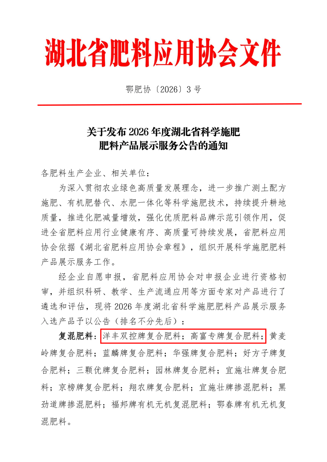 近日,湖北省肥料应用协会发布《2026年度湖北省科学施肥肥料产品展示服务公告》,新洋丰“洋丰双控”与“高富专ARC”两大系列产品凭借突出的技术创新性与田间应用成效成功入选。